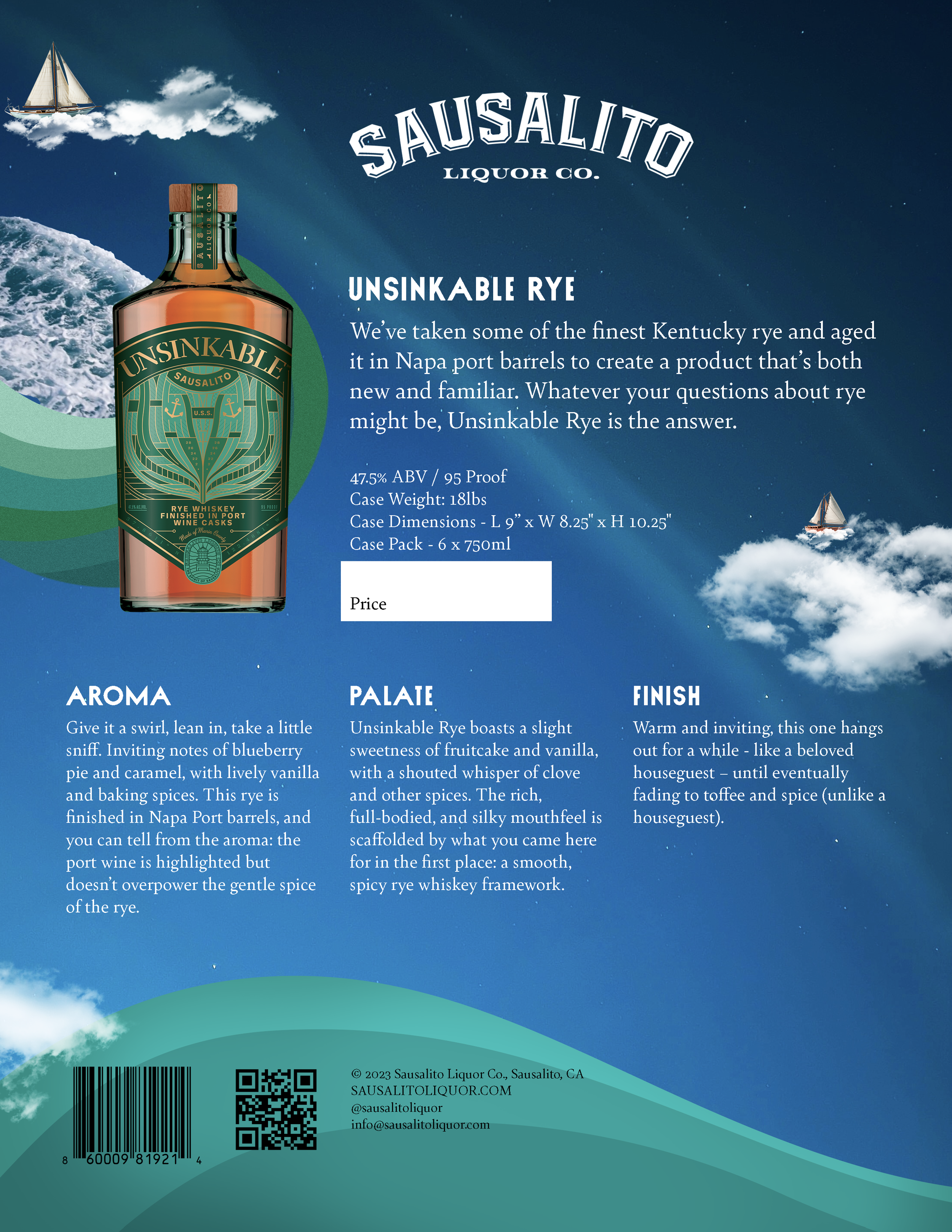 PRINT.SELL.REPEAT. Unsinkable Rye Sell Sheet Unsinkable Rye Shelf Talker Unsinkable Bourbon Shelf Talker Marin Coastal Gin Shelf Talker Unsinkable Rye Case Tucker Unsinkable Bourbon Case Tucker Marin Coastal Gin Coaster Unsinkable Bourbon Sell Sheet Full Portfolio Sell Sheet Unsinkable Whiskey Coaster Marin Coastal Gin Sell Sheet Marin Coastal Gin Case Tucker Counter Card